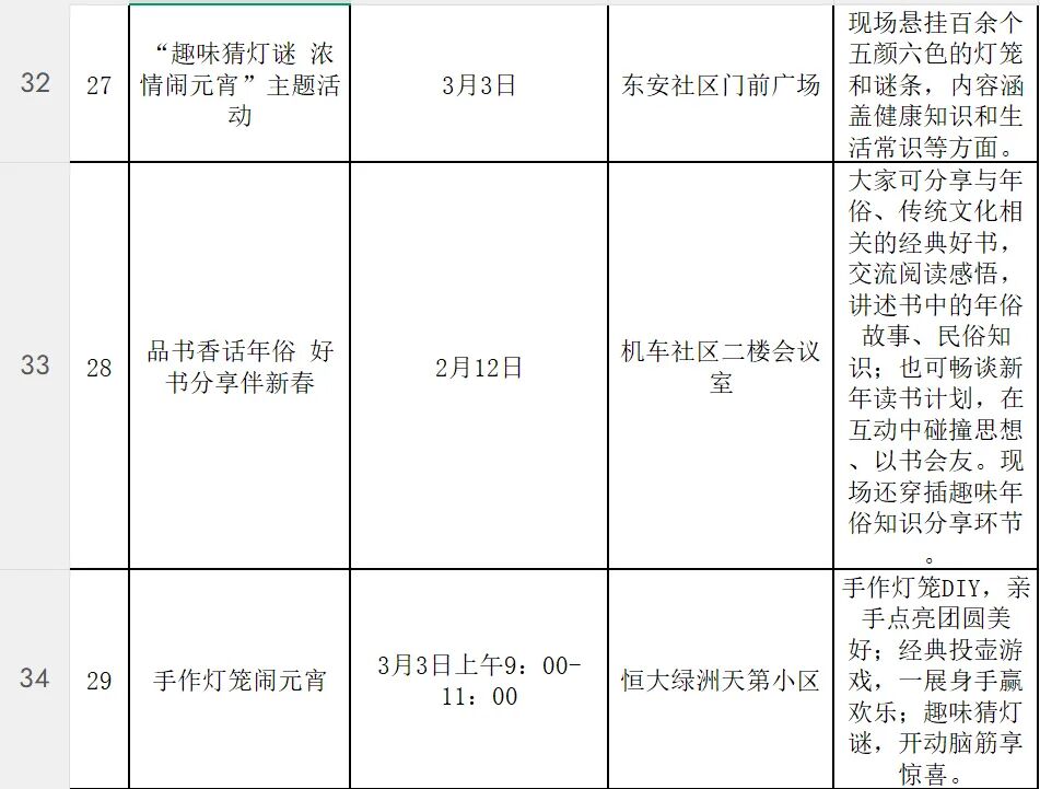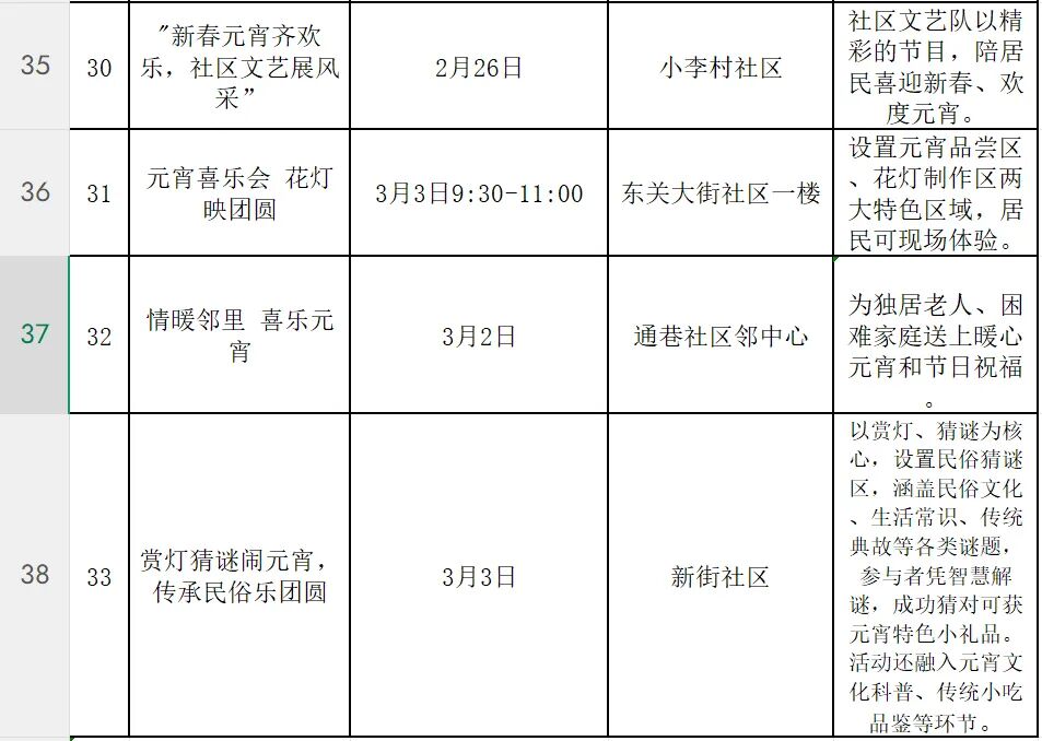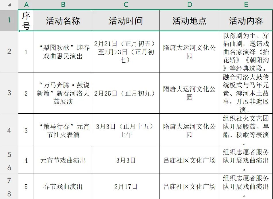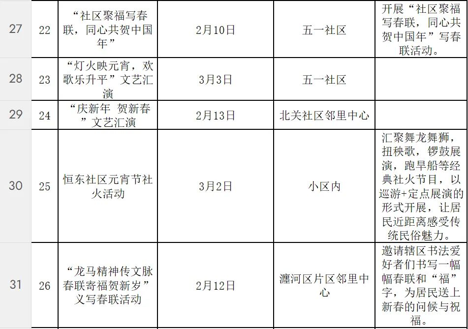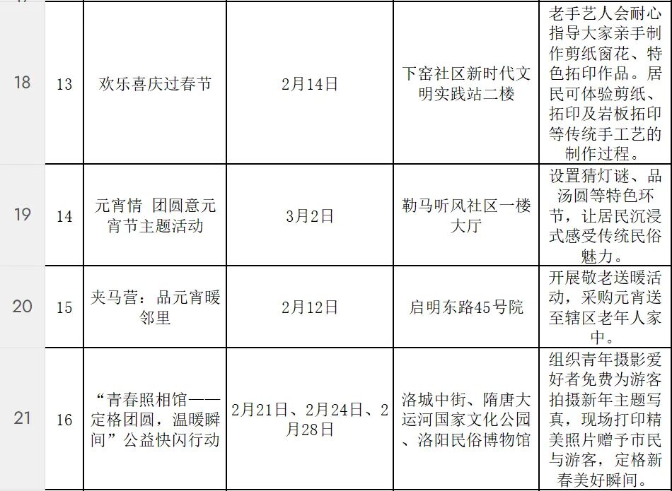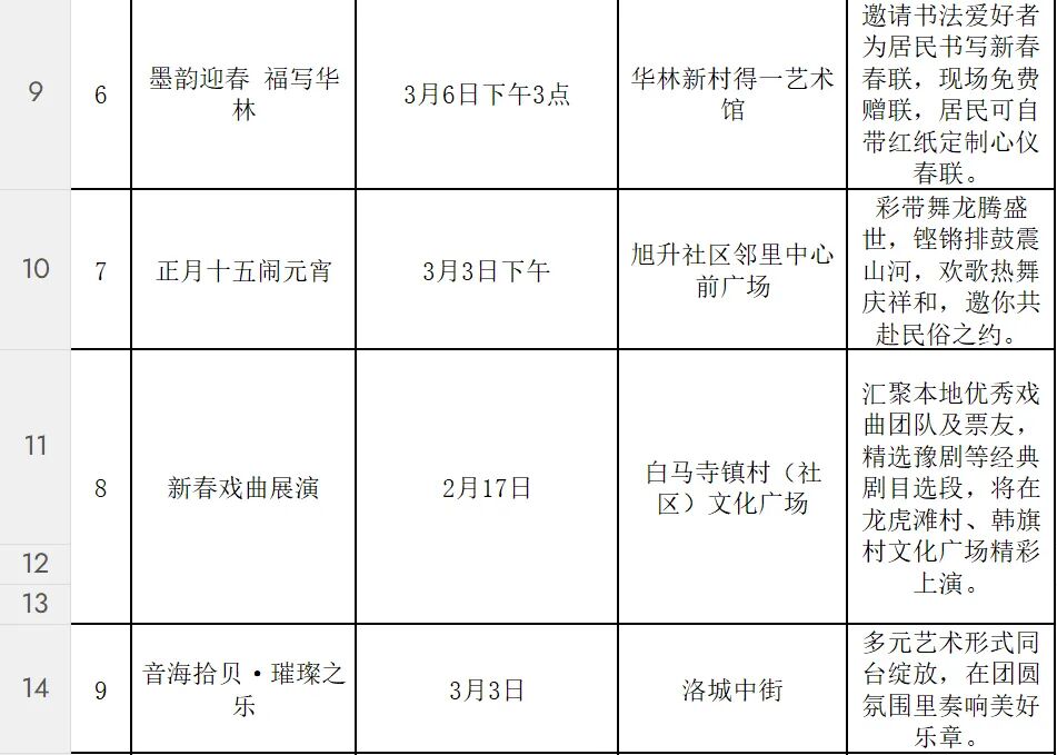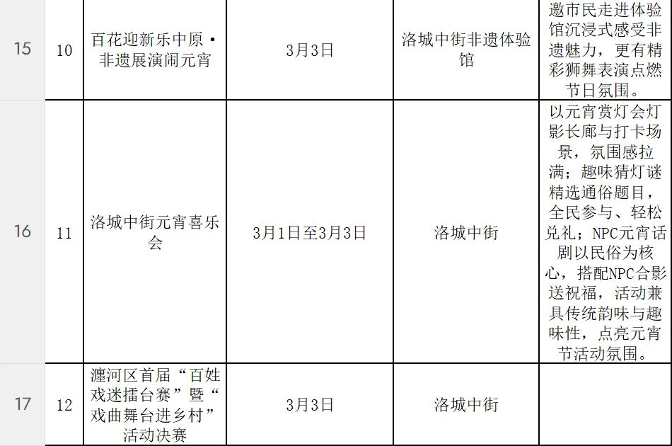 活动形式多样、内容丰富。在隋唐大运河文化公园、洛城中街等处,举办豫剧、曲剧等戏曲惠民演出;“万马奔腾·鼓说新篇”河洛大鼓展演等非遗项目展示,让传统艺术在新时代焕发光彩;元宵社火表演中,有铿锵的锣鼓、腾跃的彩龙、摇曳的旱船。各社区也将同步开展写春联送福字、元宵制作、猜灯谜、民俗表演等活动,让居民在家门口感受浓浓的春节气息。